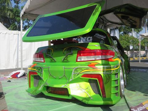 Full custom body kit, body drop, custom pintu with peneumatic dan android, custom kap mesin with motorized dan android, wide body, repaint green with Sikkens, full body realis airbrush with free hand, 4pcs custom foglamp, facelift lampu depan pakai punya Honda Civic 2013, facelift lampu rem pakai punya Honda Accord 2008.