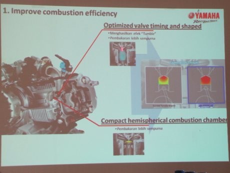 Di Blue Core, Yamaha menambahkan optimized valve timing and shaped dan Compact hemispherical combustion chamber.