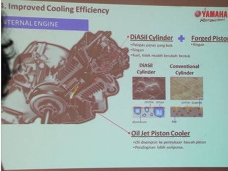 Untuk mengatasi hal itu, Yamaha menambahkan sistem pendingin baru. DiASil Cylinder dan Forged Piston pun ditambahkan. DiASil Cylinder memiliki keunggulan untuk melepas panas yang baik. Konturnya pun ringan dan kuat, tidak mudah berubah bentuk. Sementara Forged Piston yang diusung di mesin Blue Core dibuat lebih ringan.