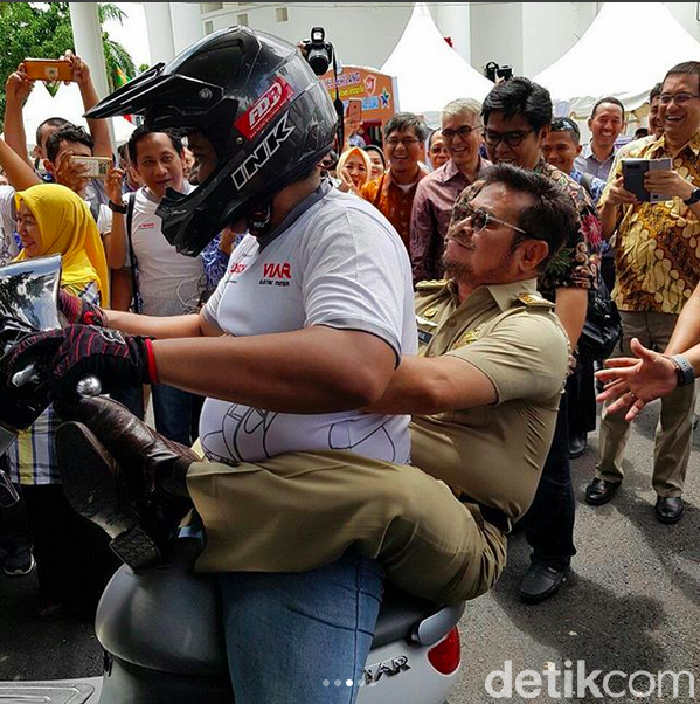 "Foto ini (Syahrul Yasin Limpo selaku Gubernur Sulawesi Selatan) menunjukkan bahwa motor listrik juga sama kok dengan motor bakar. Ini dipakai freestyle," kata Corporate Manager PT Triangle Motorindo Deden Gunawan yang punya motor listrik Viar Q1 ini.
