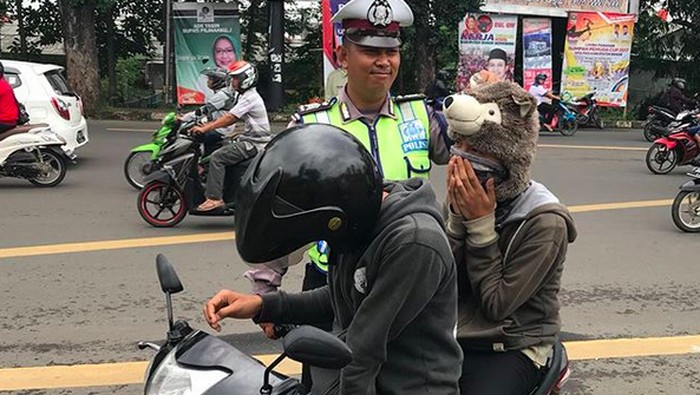 Seperti yang baru saja terlihat di akun instagram @tmcpolresbogor. Bukannya pakai helm untuk melindungi kepala, orang ini justru malah memakai topeng boneka berbentuk kepala binatang di kepalanya.