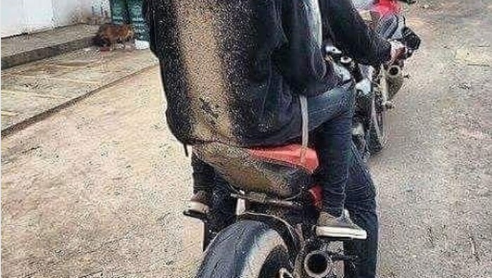 Foto ini menunjukkan betapa penumpang motor jadi kotor baju bagian belakang sampai helmnya. Cipratan air kotor merambat ke atas tanpa terhalang sepatbor.