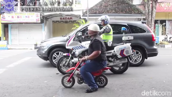 Seketika, pemotor tersebut langsung ciut. Pemotor yang tadinya naik motor trail tanpa helm langsung berubah menjadi naik motor kecil lengkap dengan helmnya. Dia pun minta maaf kepada polisinya.