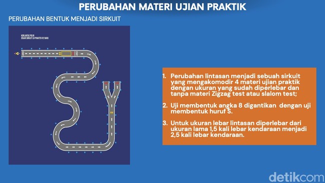 Korlantas Polri telah mengeluarkan desain layout sirkuit ujian surat izin mengemudi (SIM) C. Kini, materi zig-zag dan manuver angka delapan dihapus. Ujian praktik SIM C saat ini menggunakan empat materi.