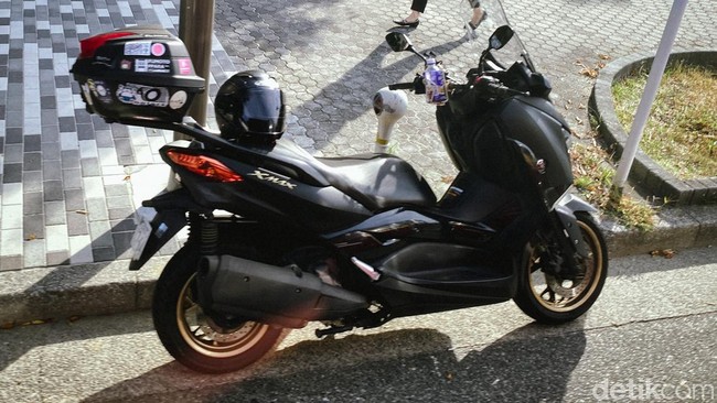 Dalam perjalanan detikOto menuju Big Sight, Tokyo, Jepang, tepatnya di wilayah Tatsumi, terdapat salah satu skutik bongsor yang parkir di pinggir jalan. Motornya bahkan tidak dilengkapi pelat nomor.