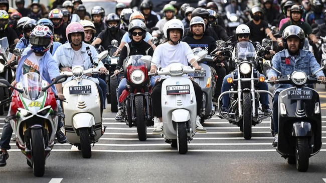 Calon wakil presiden (cawapres) nomor urut 2 Gibran Rakabuming Raka melakukan Sunday Morning Ride (Sunmori) bersama beberapa selebritas. Gibran yang memboncengi istrinya Selvi Ananda menunggangi motor Vespa putih.