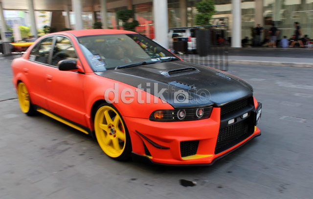 Untuk mendapatkan hasil sempurna, Rey, pemilik mobil Mitsubishi Galant, mempercayakan pada rumah modifikasi Wan2try Surabaya. Untuk mendapatkan bodi berbahan karet, sebelumnya bodi mobil dikerok sampai bersih hingga tidak menyisahkan warna bawaan pabrik. (M Ikhsan/detikOto).