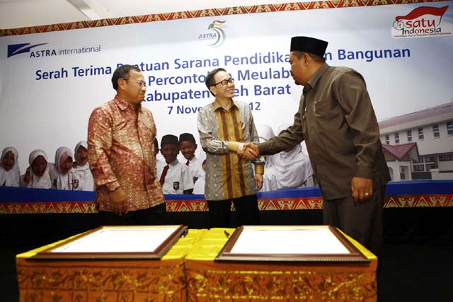 - PT Astra International Tbk menyerahkan gedung sekolah dan sarana pendidikan SDN Percontohan Meulaboh hasil rekonstruksi pasca bencana tsunami tahun 2004 lalu kepada Pemerintah Daerah Kabupaten Aceh Barat. Penyerahan dilakukan oleh Presiden Direktur PT Astra International Tbk Prijono Sugiarto kepada Bupati Aceh Barat Teuku Alaidinsyah, Rabu (7/11/2012).
