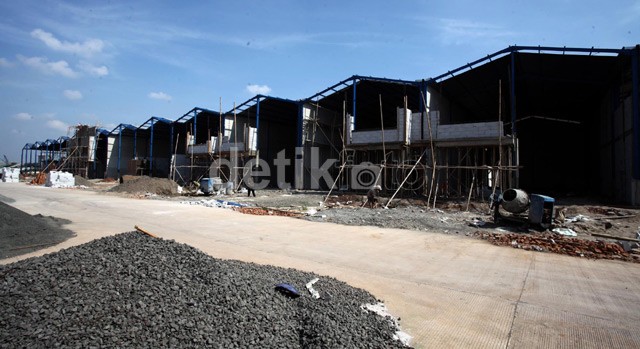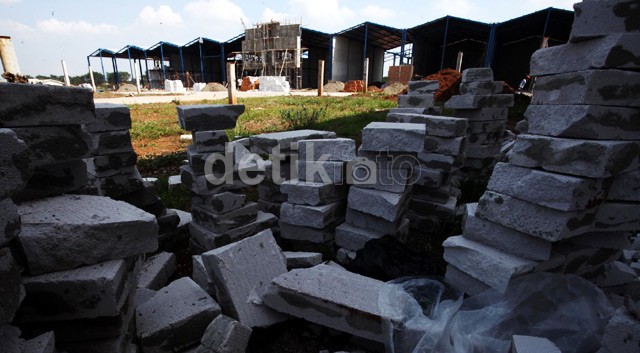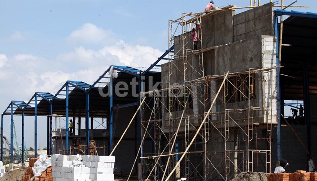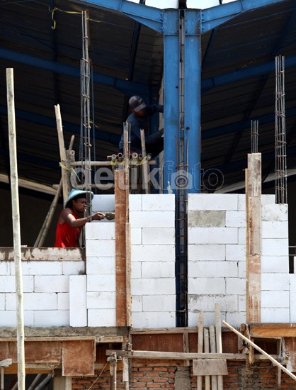 Para pekerja menyelesaikan pembangunan dinding gudang.<br />