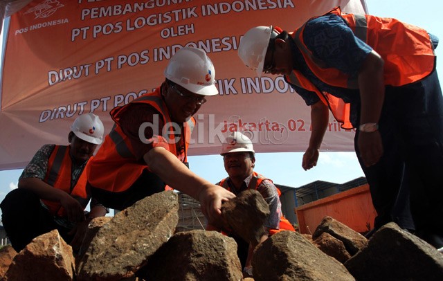 Dirut PT Pos Logistik Indonesia Febriyanto bersama Dirut PT Pos Indonesia meletakan batu pertama pembangunan gudang di Cakung, Jakarta Timur.<br />