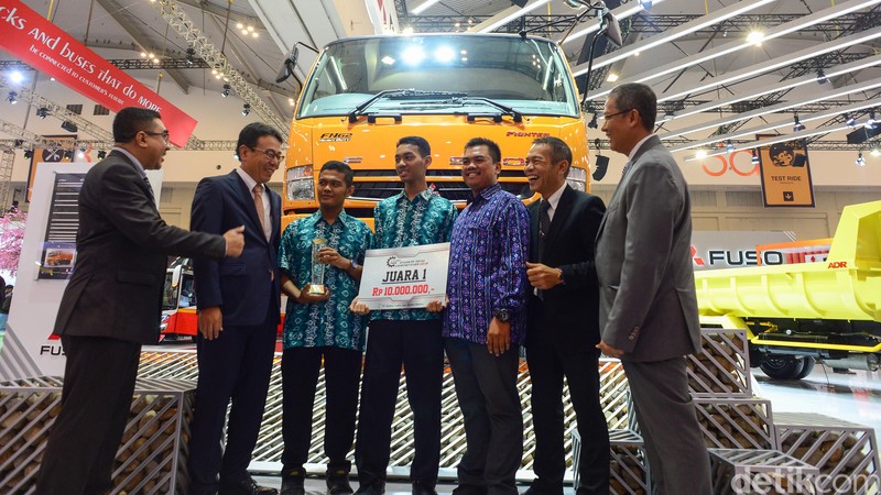 Juara I menerima penghargaan. Hadir dalam pengumuman kompetisi tersebut adalah Sales & Marketing Director PT Krama Yudha Tiga Berlian Motors (KTB) Duliatmono, Presdir KTB Atsushi Kurita, guru dan siswa pemenang juara Fuso Student Skill Competition 2018, Head of After Sales Service Unit Agus Nevianto, dan Director of Administration & Human Resources Syaifuddin Said.
