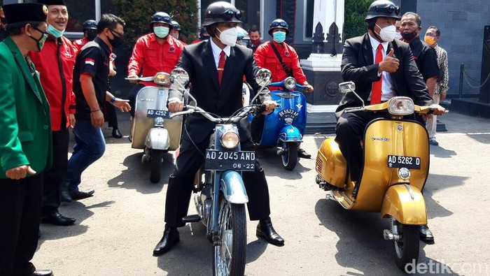 Bakal calon bupati M Said Hidayat terlihat mengendarai motor DKW warna biru, sedangkan bakal calon wakil bupati Wahyu Irawan mengendarai motor Vespa Sprint warna emas.