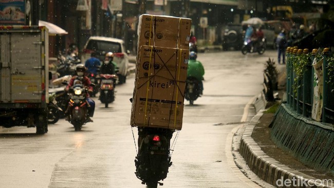 Tangerang Selatan - Seorang pemotor yang membawa barang berukuran besar melintasi kawasan Ciputat. Pemotor itu diketahui mengangkut kulkas. Ini potretnya.