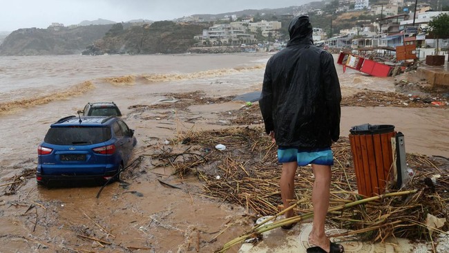 Jakarta - Hujan deras yang memicu banjir bandang dilaporkan melanda Pulau Kreta di Yunani. Terjangan banjir bandang itu menyapu mobil-mobil sampai hanyut ke lautan.