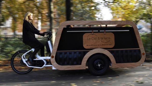Manajer rumah duka "Le Ciel et la Terre", Isabelle Plumereau, mengendarai kendaraan pengangkut jenazah yang diberi nama "corbicyclette" di Paris, Prancis, Senin (31/10/2022).