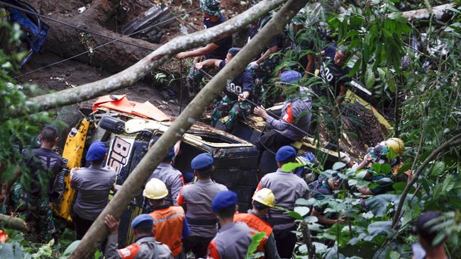 Sejumlah petugas gabungan mengevakuasi mobil yang jatuh ke jurang karena terbawa longsor akibat dampak gempa di Cugenang, Kabupaten Cianjur, Jawa Barat, Senin (21/11/2022). (ANTARA FOTO/Yulius Satria Wijaya)