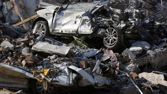 Turki - Gempa tidak hanya menimbulkan korban jiwa dan kerusakan bangunan di Turki. Kendaraan warga juga turut menjadi korban. Ini penampakannya.