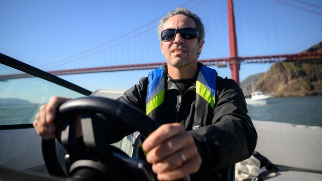 CEO Candela US, Tanguy de Lamotte, mengemudikan kapal listrik C-8 di teluk San Francisco, California, Rabu (8/2/2023).