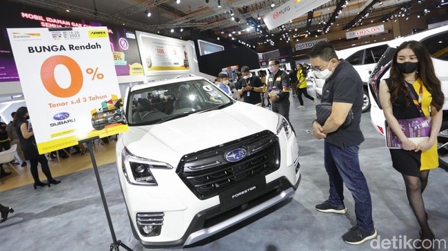 Pengunjung mengamati aneka mobil yang ditampilkan oleh booth MUFG, Bank Danamon dan Adira Finance pada ajang Indonesia International Motor Show (IIMS) 2023 di JIExpo Kemayoran, Jakarta.
