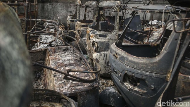 Jakarta - Belasan bajaj jadi korban kebakaran di Duren Sawit, Jakarta. Bajaj-bajaj tersebut tampak hangus.
