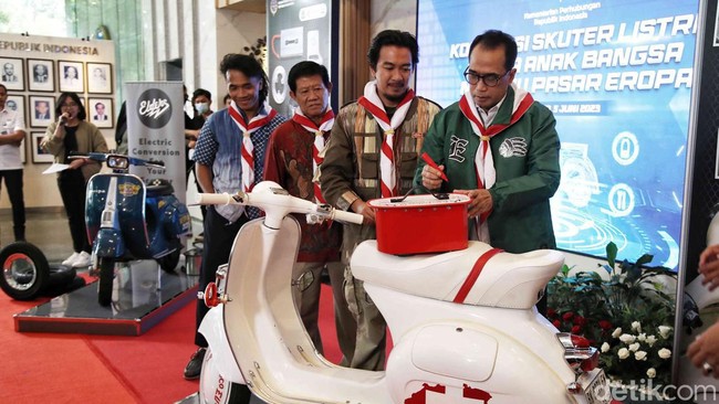 Jakarta - Menhub Budi Karya bersama Komunitas Vespa Indonesia menandatangani skuter listrik konversi dari salah satu UKM nasional yang akan melakukan ekspansi ke Eropa.
