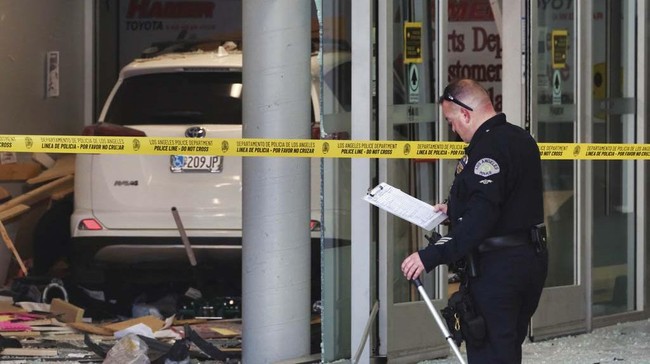 Los Angeles - Mobil yang dikemudikan pelanggan menabrak layanan dealer Toyota di Mission Hills, Los Angeles. Beberpa orang dilaporkan terluka.