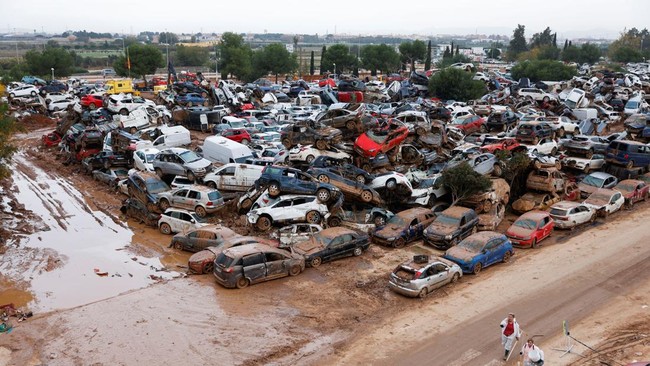 Spanyol - Ribuan mobil terdampak parah oleh banjir dahsyat yang melanda wilayah Valencia, Spanyol. Mobil-mobil rusak menumpuk di kawasan industri hingga jalan perumahan.
