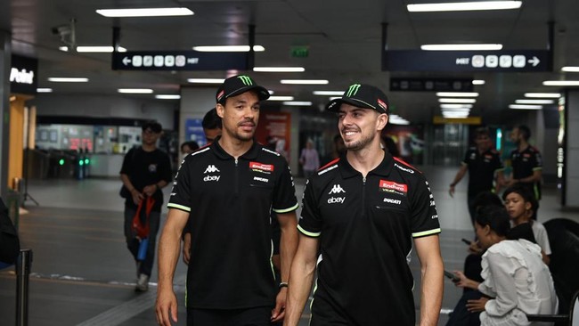 Jakarta - Duo pembalap VR46 Racing Team, Fabio Di Giannantonio dan Franco Morbidelli, seru-seruan keliling Jakarta jelang MotoGP Mandalika. Mereka naik bajaj hingga MRT.