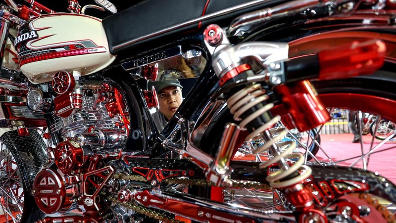 Kontes otomotif modifikasi yang merupakan bagian dari kegiatan komunitas CB Bekicot ke-12 tersebut diikuti oleh ribuan peserta dari berbagai daerah sebagai wadah bagi pecinta motor klasik untuk mengekspresikan kreativitasnya sekaligus ajang silaturahmi. Foto: ANTARA FOTO/Muhammad Mada