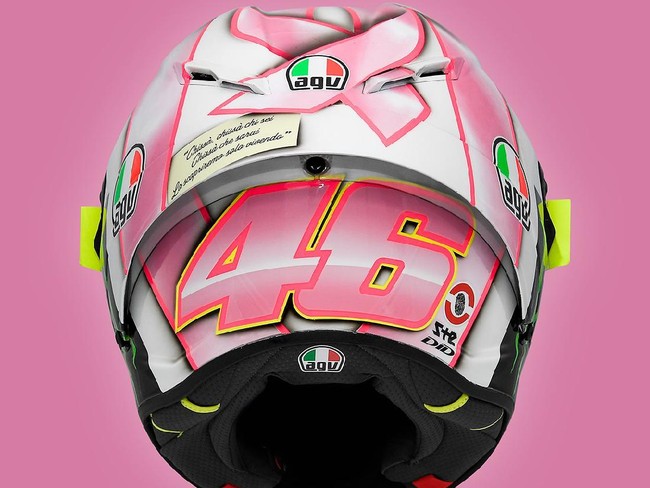 Dikutip dari laman MotoGP, helm spesial Rossi ini terdapat pita berwarna pink yang menghiasi di bagian atas. Lalu pada bagian belakang, terdapat nomor balap Rossi yakni 46 dengan balutan kelir pink.