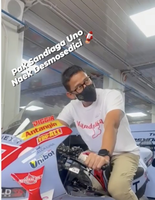 Salah satunya diunggah oleh salah satu sponsor dari Gresini Racing, yakni Federal Oil. Terlihat Sandiaga Uno tengah duduk di atas tunggangan Fabio di Giannantonio, yakni Desmosedici GP21.
