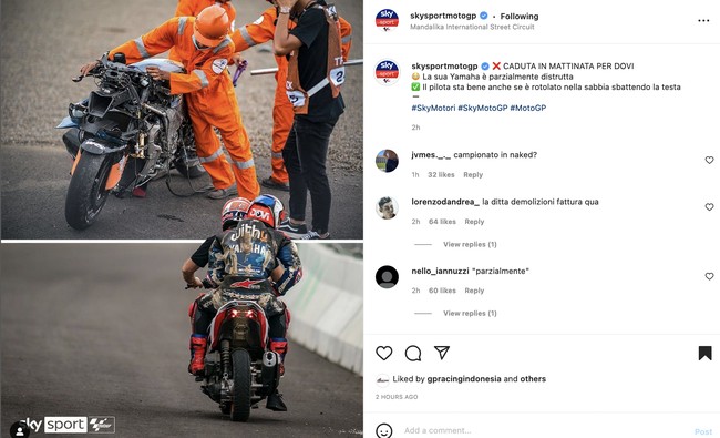 Dalam postingan di Instagram Skysports, motor Yamaha milik Dovizioso mengalami kerusakan parah. Bagian depan motor Yamaha YZR-M1 milik dia nyaris tak berbentuk lagi, sementara fairingnya sudah hancur. Bagian belakang baju balapnya juga terlihat mengalami kerusakan parah.