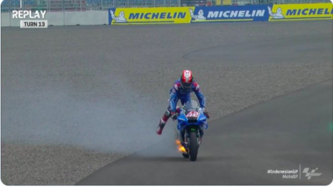 Rins yang mengetahui motornya terbakar langsung melipir ke pinggir trek dan segera loncat dari atas motor. Setelah itu, kuda besi miliknya terbakar dan langsung dipadamkan oleh para marshals yang telah siap siaga.