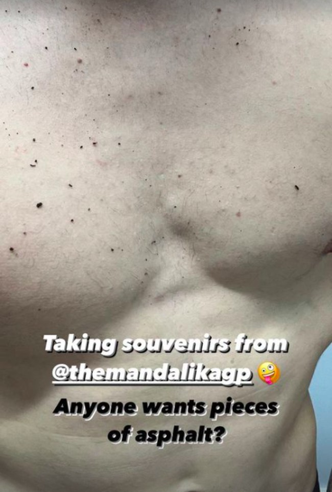 Pebalap tim Suzuki Ecstar Alex Rins misalnya membagikan momen saat aspal Sirkuit Mandalika menempel di dadanya.