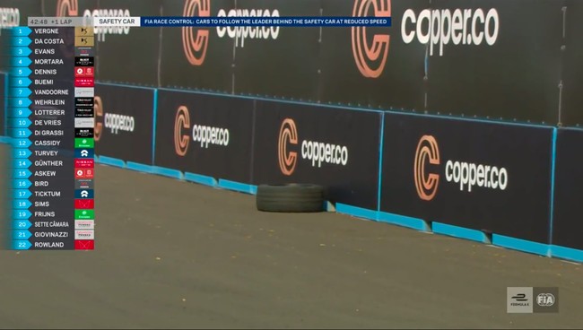 Atas insiden ini, pebalap dari tim Mahindra Racing itu tak bisa melanjutkan balapan. Lalu bendera kuning atau yellow flag dikibarkan dan safety car masuk selama beberapa menit. Sejauh ini belum diketahui dengan pasti apa yang menyebabkan ban Oliver Rowland bisa lepas.