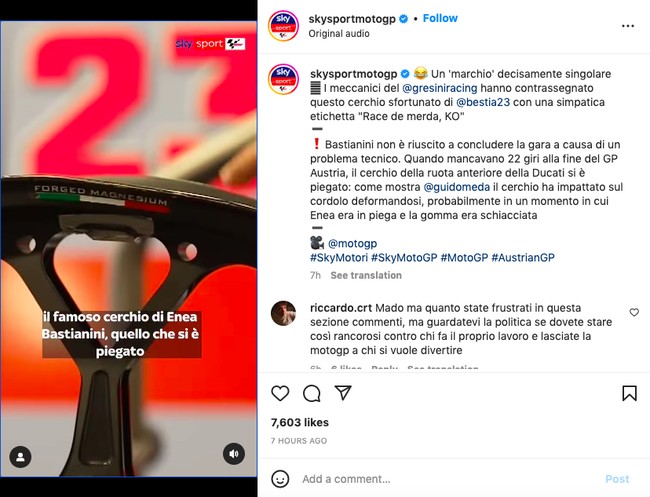 Dia juga memperlihatkan tulisan yang ditempeli oleh tim mekanik pada velg tersebut. Tim teknisi Bastianini menuliskan "Race de merda, KO", yang berarti "Balapan sial, KO".