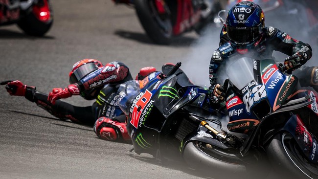 "Aku tidak bermaksud untuk menyalip, aku hanya ingin berusaha bertahan di tikungan. Bezzecchi ada di kanan, Miguel di kiri. Aku menyentuh motor Bezzechi dan Miguel. Aku tidak punya jarak," ujar Quartararo dalam wawancara dengan MotoGP, dikutip Senin (1/5/2023).