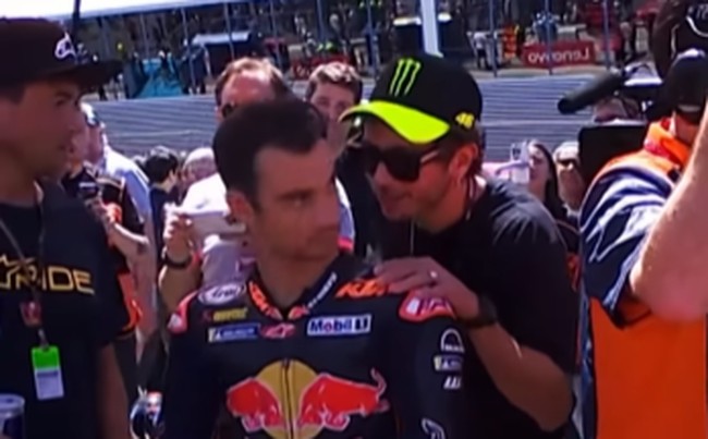 Ada satu momen unik yang terekam kamera usai MotoGP Spanyol, akhir pekan lalu. Legenda balap asal Italia, Valentino Rossi menghampiri Dani Pedrosa dan berbisik dari arah belakang. Apa yang dikatakan Rossi ke test rider KTM tersebut?