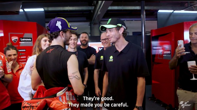 Sesaat setelah balapan usai, sang mentor Valentino Rossi sempat menyambangi paddock tim Ducati Lenovo untuk berbincang dengan Bagnaia. Rossi rupanya menyampaikan sesuatu ke Bagnaia. Apa katanya?