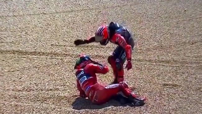 Another massive twist to the #MotoGP title picture as @PeccoBagnaia and Maverick Viñales made contact and crashed out of podium contention at #GP1000 😱#FrenchGP 🇫🇷 pic.twitter.com/CISG72pAMP