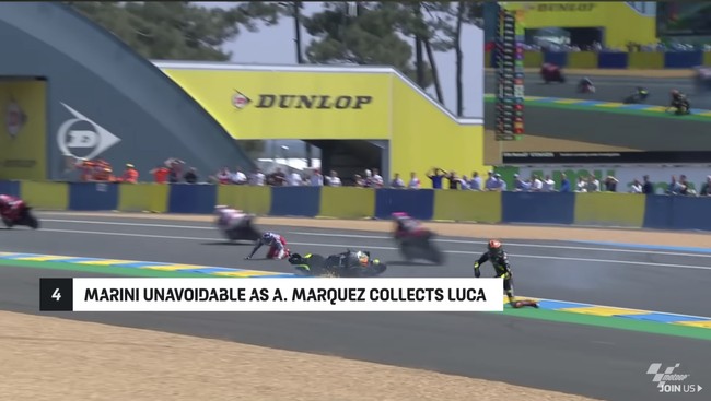 Di lap keenam MotoGP Prancis, para penonton dihadapkan dengan momen menegangkan. Alex Marquez menabrak sisi kanan motor Luca Marini dan meluncur di dalam lintasan. Alex jatuh masih di dalam racing line. Dia pun berusaha merangkak menghindari pebalap lainnya yang masih memacu motor.