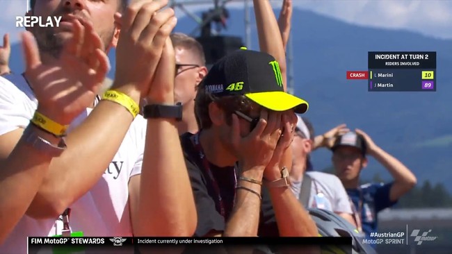 Saat kecelakaan Luca Marini terjadi, Rossi melihat secara langsung. Kamera langsung menyorot ekspresi Rossi ketika adiknya itu terjatuh. Rossi menutupi mukanya tanda kekecewaan. Sebab, tidak ada pebalap Mooney VR46 Racing Team yang berhasil menyentuh garis finis di Sprint Race MotoGP Austria.