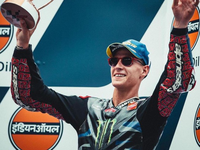 Pebalap Monster Energy Yamaha Fabio Quartararo bisa sedikit tersenyum karena berhasil mengamankan podium tiga MotoGP India 2023. Tapi jangan senang dulu, Yamaha dan El Diablo bisa naik podium karena dua rival di depannya, Francesco Bagnaia (Ducati) dan Marc Marquez (Honda) mengalami crash.