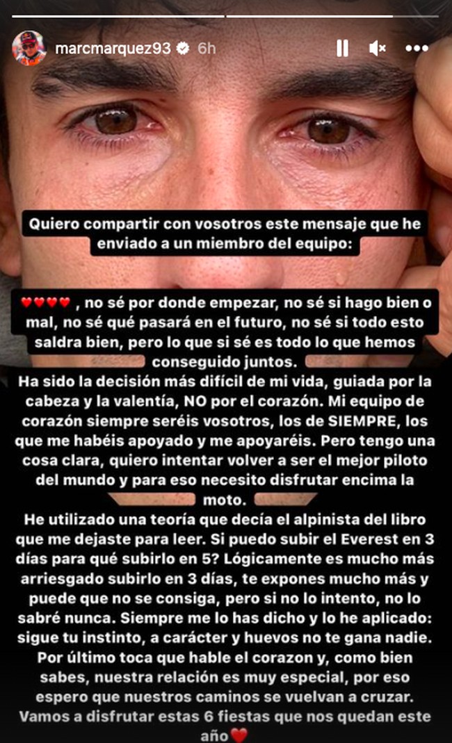 "Saya tidak tahu mulai dari mana, saya tidak tahu apakah langkah saya benar atau salah, saya tidak tahu apa yang terjadi di masa depan, saya tidak yakin apa akan baik-baik saya, tapi saya tahu kita sudah mencapai banyak hal bersama. Ini merupakan keputusan tersulit dalam hidup saya yang didasarkan dari kepala dan keberanian saya, BUKAN hati saya. Tim di hati saya selalu kalian, kalian yang selalu mendukung saya dan akan mendukung saya. Tapi satu hal yang jelas, saya ingin menjadi pebalap terbaik di dunia lagi dan yang saya harus lakukan harus menikmati saat berada di atas motor. Saya menggunakan teori yang disebutkan pendaki gunung dalam buku yang Anda berikan untuk saya baca. 'Jika saya bisa mendaki Everest dalam tiga hari, kenapa saya harus melakukannya dalam lima hari?' Secara logika, melakukannya dalam tiga hari memang lebih berisiko dan Anda mengekspos diri Anda lebih lagi dan mungkin saja tidak berhasil, tapi saya akan mencoba, saya tidak pernah tahu. Anda telah memberi tahu saya, ikuti instingmu, dan ini soal karakter dan keberanian, tidak ada yang mengalahkan Anda. Pada akhirnya hati yang berbicara, seperti kalian tahu, hubungan kita sangat spesial, saya harap kita akan bertemu lagi. Sekarang mari kita nikmati enam balapan tersisa yang menanti hingga akhir tahun," demikian tulis Marquez di instastorynya.