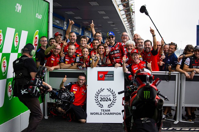 Francesco 'Pecco' Bagnaia dan Enea Bastianini sukses membawa Ducati Lenovo Team jadi juara dunia tim MotoGP 2024. Tim pabrikan Ducati itu sukses mengalahkan Prima Pramac Racing yang tahun 2023 lalu mencetak sejarah sebagai tim satelit yang meraih juara dunia tim MotoGP 2023.
