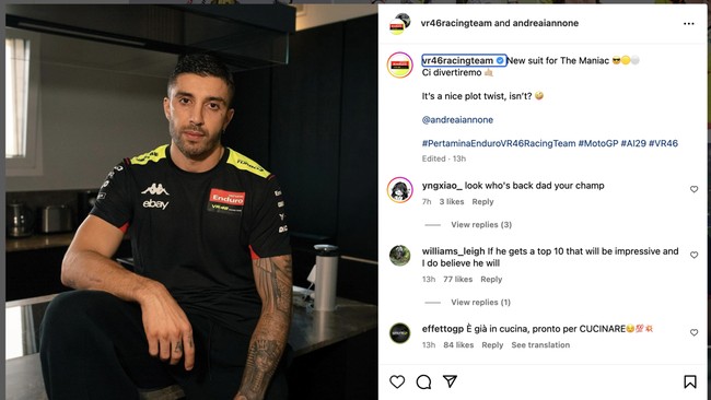 "Tantangannya tentu gila, rumit dan menuntut, karena sudah bertahun-tahun saya tidak mengendarai sepeda motor dalam kategori ini dan belum pernah melakukan tes atau sejenisnya. Saya sangat bersemangat bisa bekerja sama dengan Ducati dan tim balap Pertamina Enduro VR46, baik karena levelnya yang sangat tinggi maupun karena persahabatan yang telah menyatukan saya selama bertahun-tahun. Saya berterima kasih kepada Valentino Rossi, Alessio Salucci, Pablo Nieto, Gigi Dall'Igna, Claudio Domenicali, dan Mauro Grassilli," tambah Iannone.