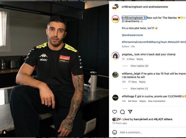 Sebagai gantinya, bos VR46 Racing Team Valentino Rossi meminta Iannone untuk menggeber Ducati Desmosedici GP23. Iannone sangat berterima kasih atas kesempatan yang diberikan The Doctor itu.