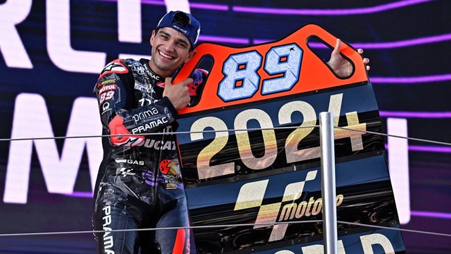 Jorge Martin berhasil mengunci gelar juara dunia MotoGP 2024 usai finis di urutan ketiga pada balapan MotoGP Barcelona yang berlangsung Minggu, 17 November 2024. Rider Spanyol itu meraup total 508 poin sepanjang musim 2024, unggul 10 poin dari Francesco Bagnaia yang harus puas jadi runner-up.