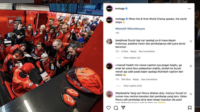 Suppo pun memperingatkan Ducati agar tidak terlalu berlarut-larut dalam romantisme bersama Marquez. Benar bahwa Marquez adalah pebalap fenomenal dengan koleksi 6 gelar juara dunia di kelas MotoGP. Tapi Ducati juga harus paham, bahwa dia masih punya seorang Bagnaia yang penampilannya sangat konsisten.