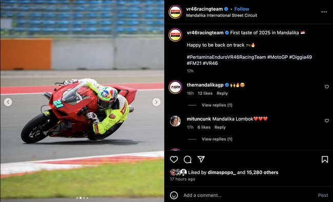 Namun, sebelum tes pramusim di Sepang, para pebalap murid Valentino Rossi latihan di Mandalika. Mereka menggunakan motor-motor andalannya, mulai dari motor jalan raya sampai motor balap. Dikutip Crash, seluruh tim VR46 MotoGP hadir di Mandalika, begitu pula pebalap Moto2 Celestino Vietti.